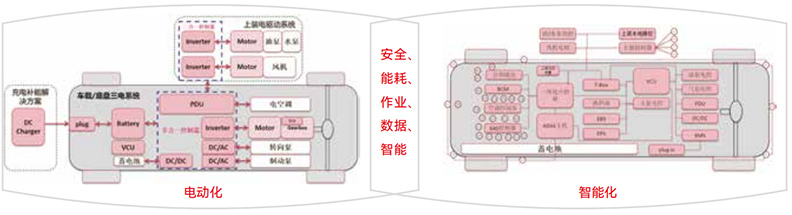 通過底盤與上裝的一體化設計,中控屏集成了車輛駕駛、上裝作業(yè)和多媒體娛樂等多功能,實現(xiàn)了“一屏多用”,簡化了架構,減少了60%的部件和線束,從而提高了性價比和可靠性